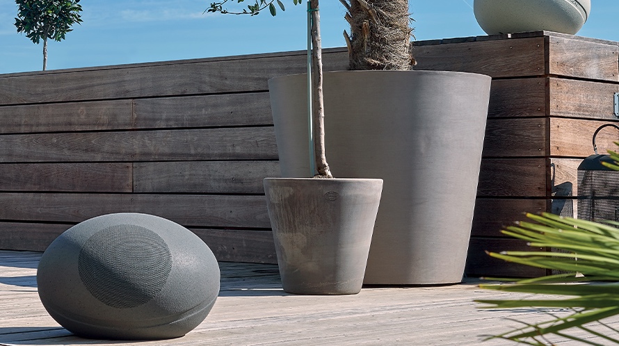 Den ydre overflade er formet som en sten og har en tekstureret, stenlignende effekt, der giver et unikt mineralsk look. De to finisher – basalt og kalksten – gør denne højttaler lige så diskret, som den er raffineret.