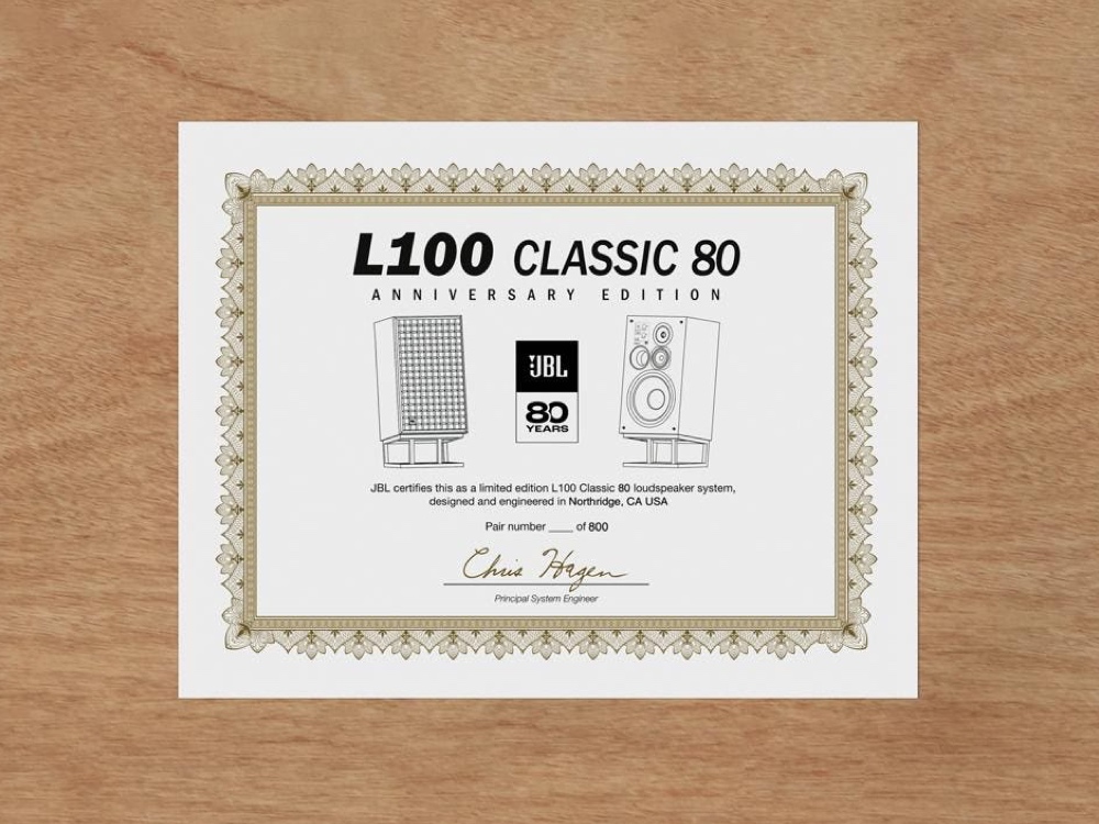 Produktionen af JBL L100 Classic 80 er begrænset til 800 matchende par på verdensplan. Hvert par inkluderer en individuelt nummereret logo signeret af den ledende systemingeniør, de leveres inkl. JS-150 højttalerstativer og i en dedikeret trækasse.